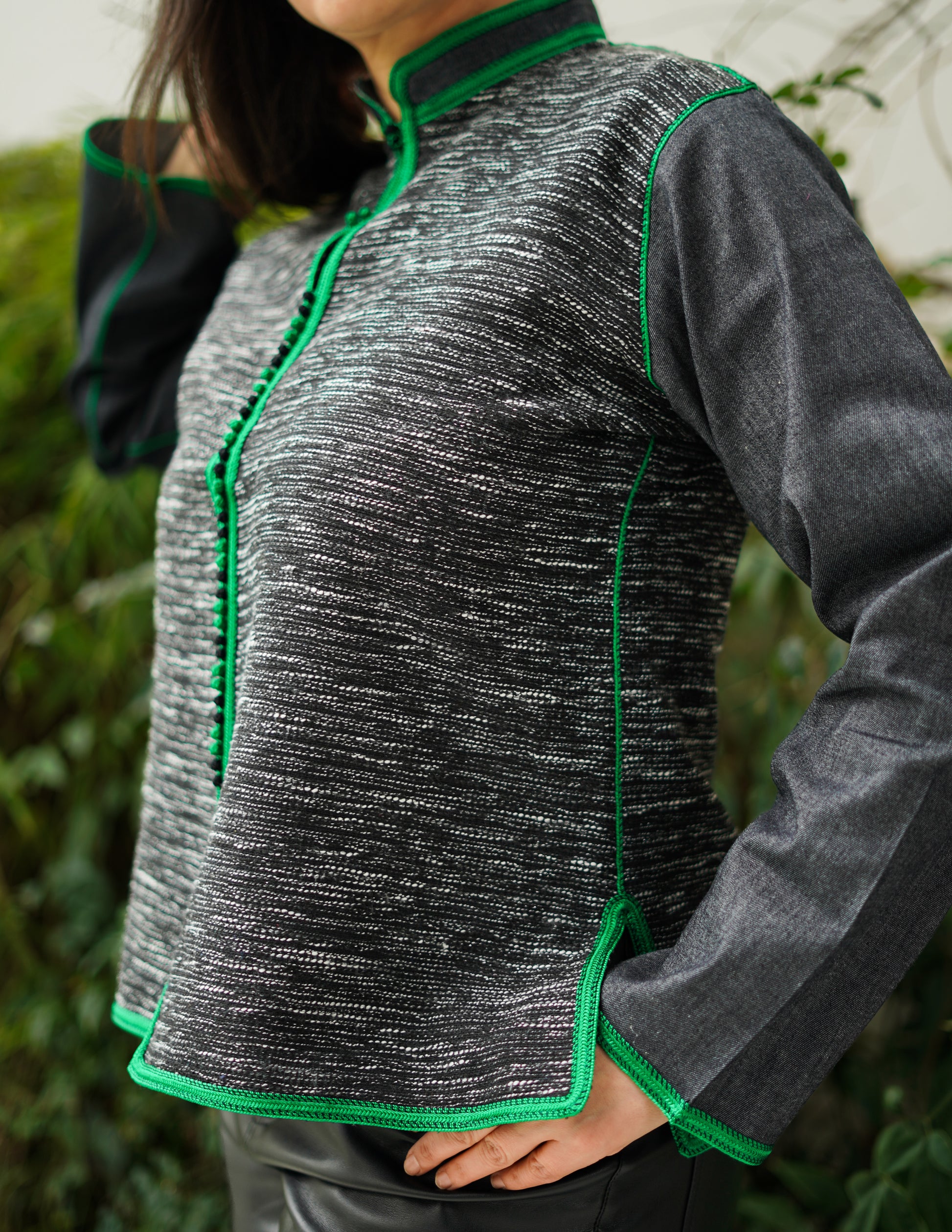 Chemisier en denim de coton et bouclette, entièrement cousu à la main selon le savoir-faire Maâlem. Une dfira délicatement ornée souligne la couture sur toute sa longueur, apportant une finition artisanale raffinée et un caractère unique à la pièce.