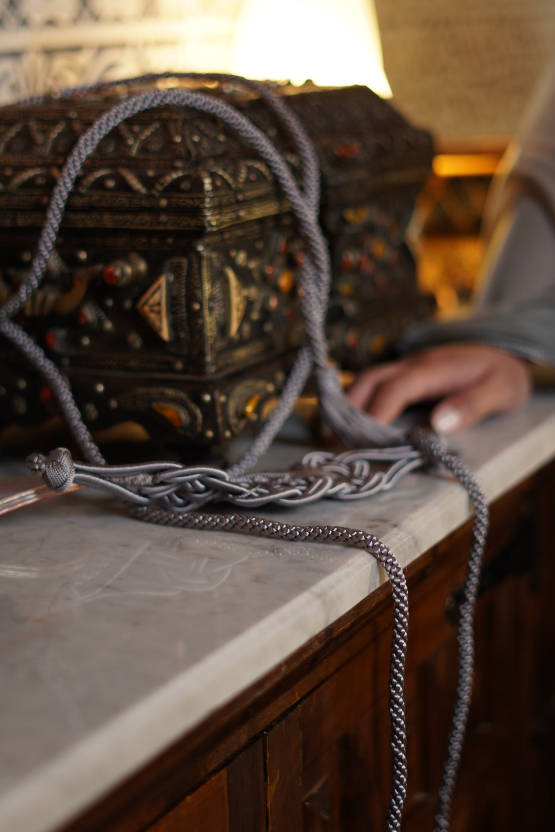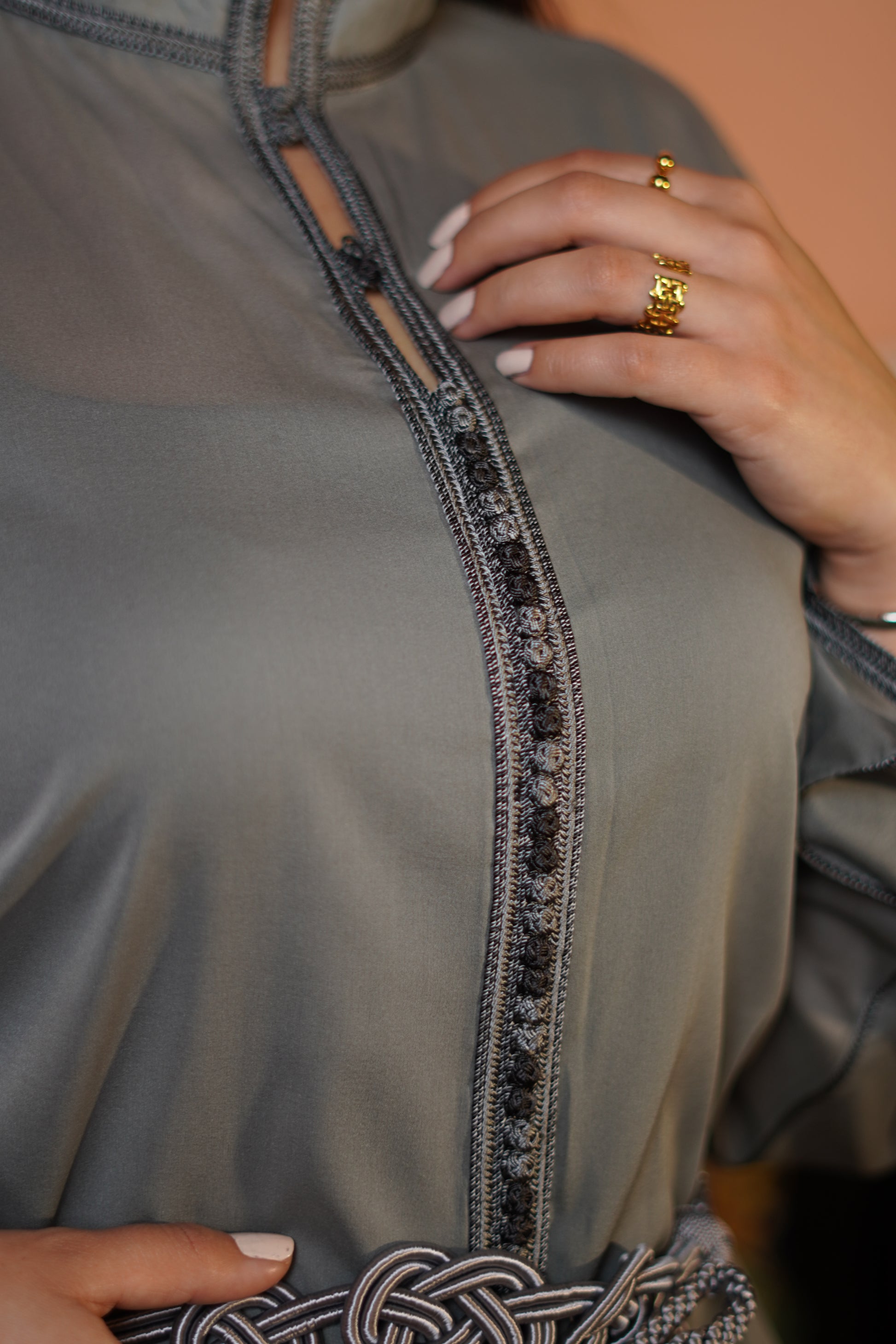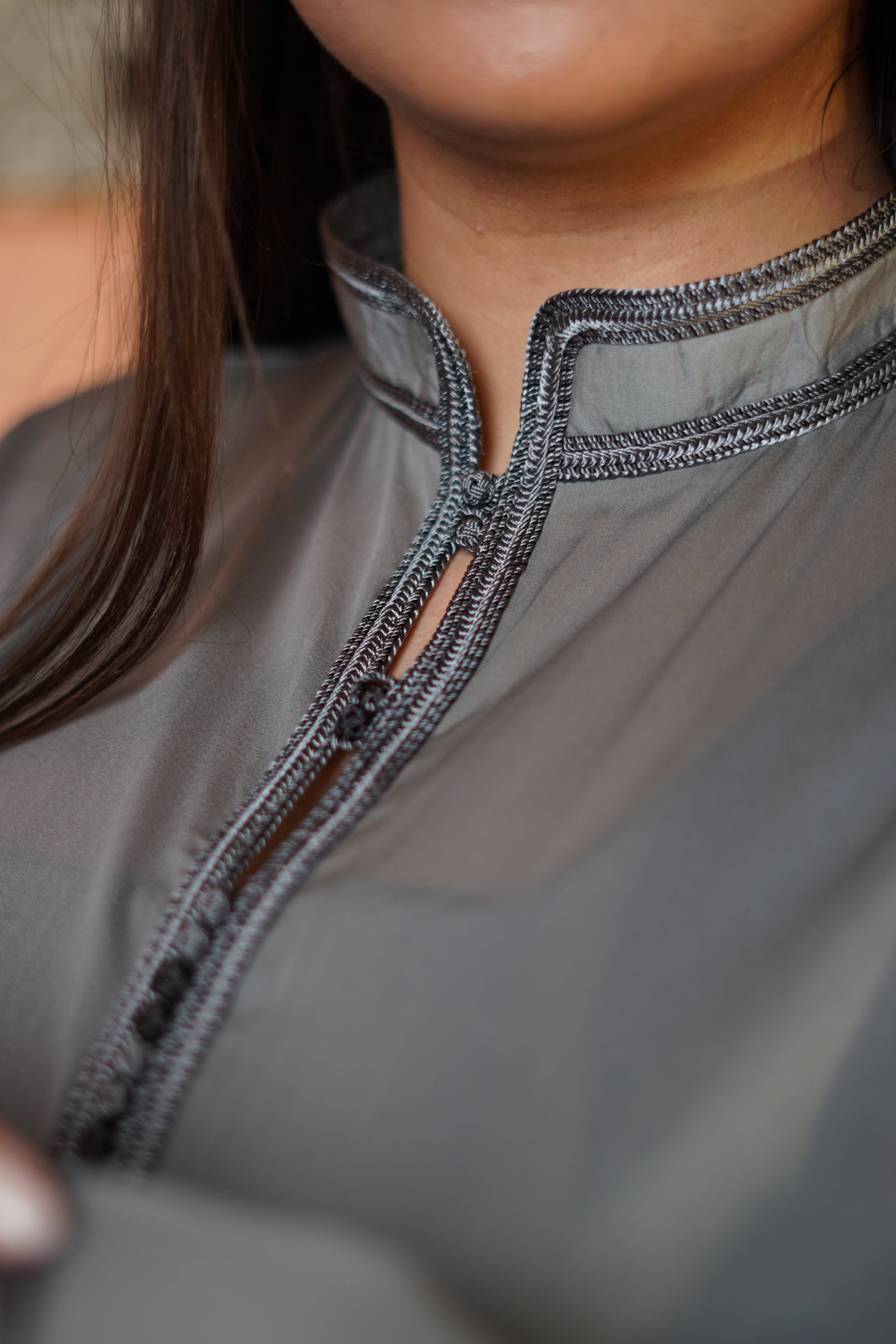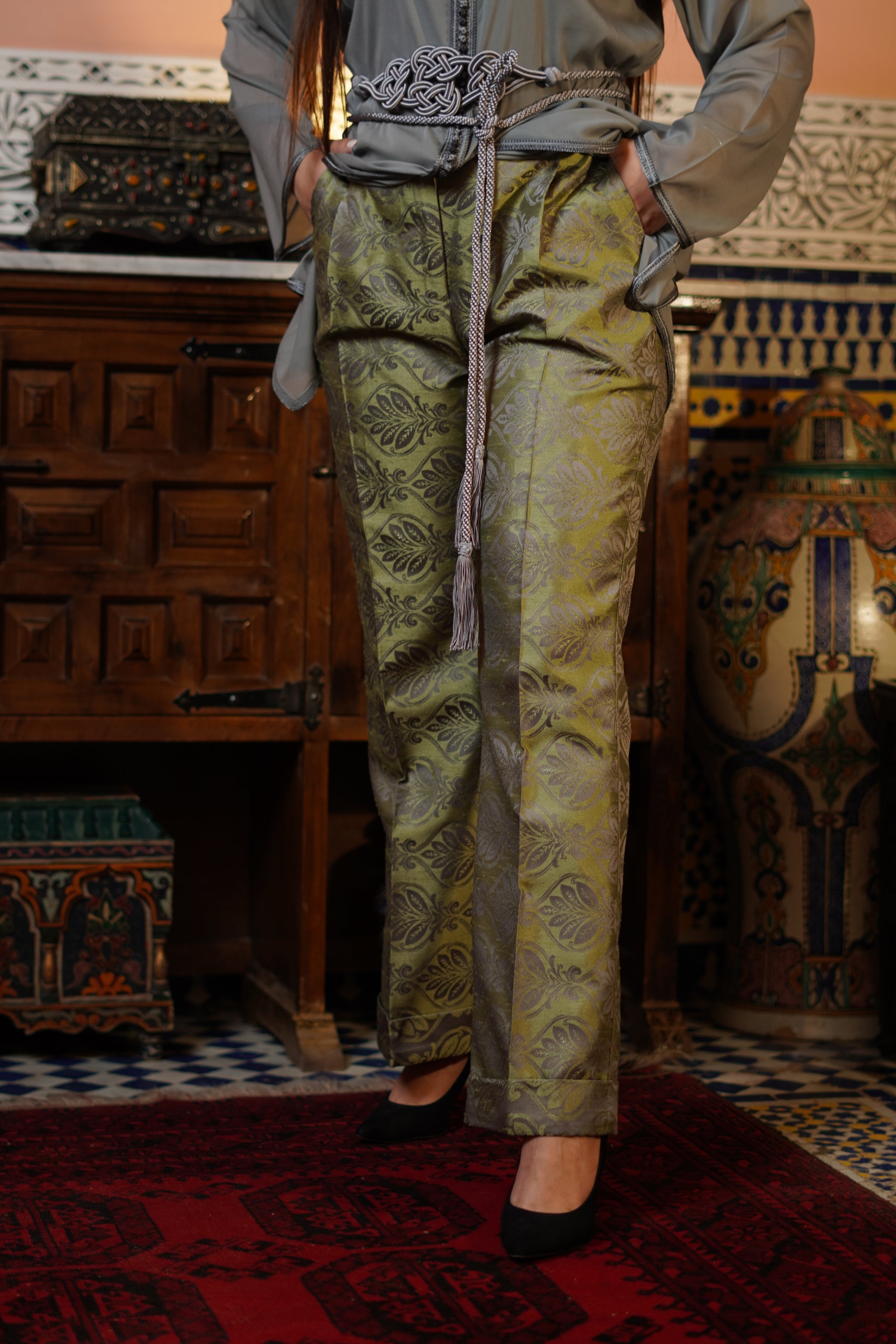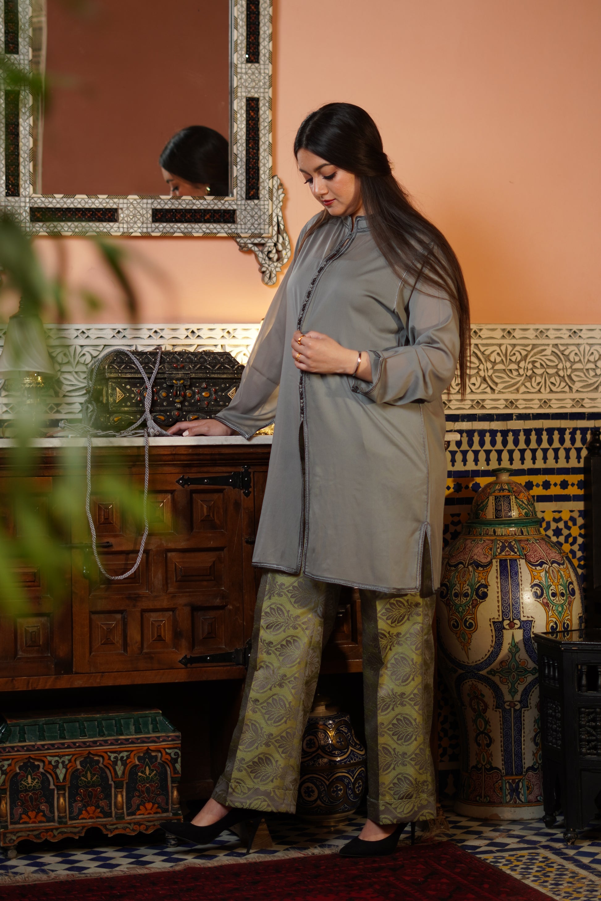 Ce chemisier midi en soie, au col officier élégant est une véritable œuvre d'art. Entièrement travaillé à la main, il se distingue par des détails marocains finement brodés, apportant une touche de luxe. La douceur de la soie se marie parfaitement avec l'élégance des broderies.