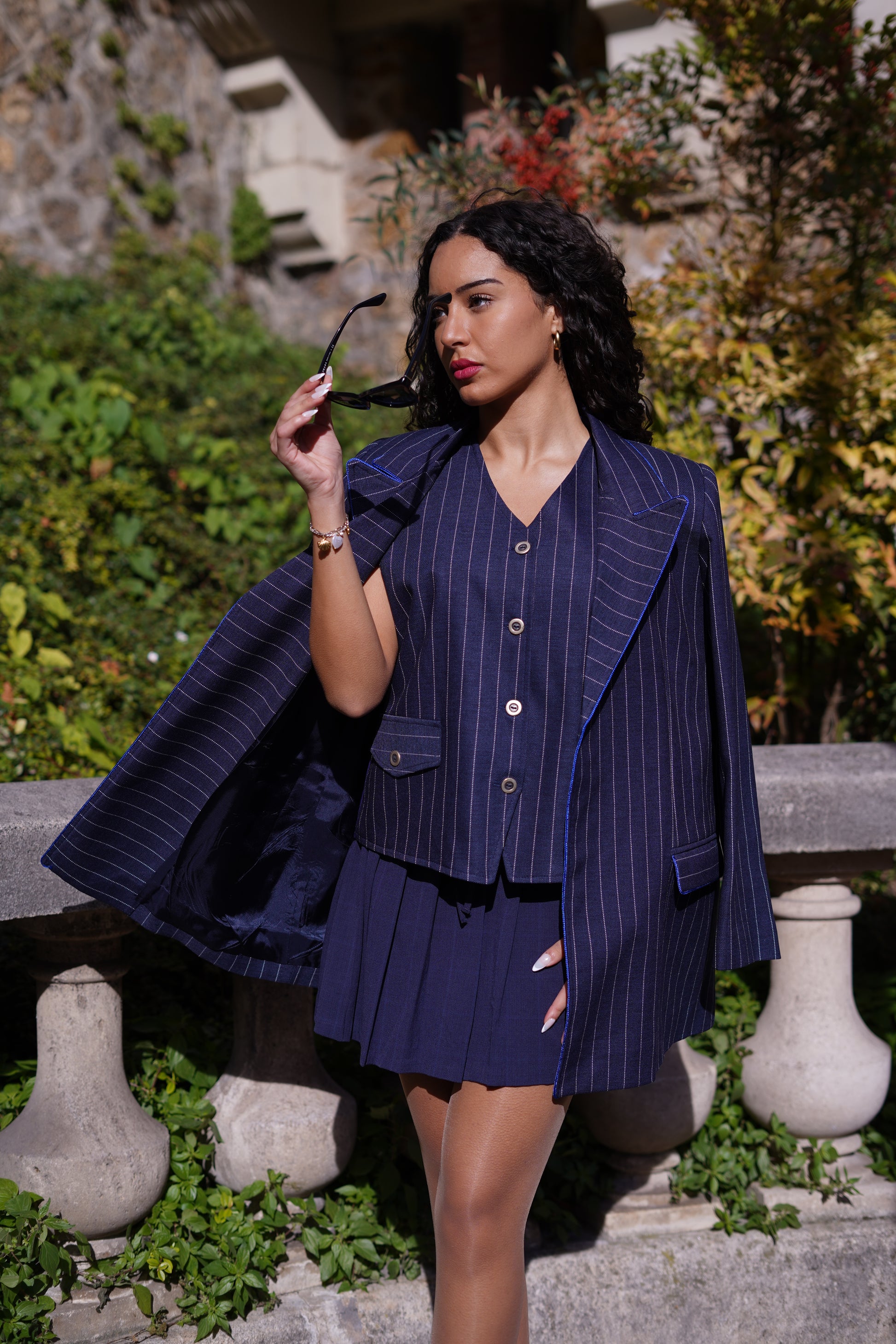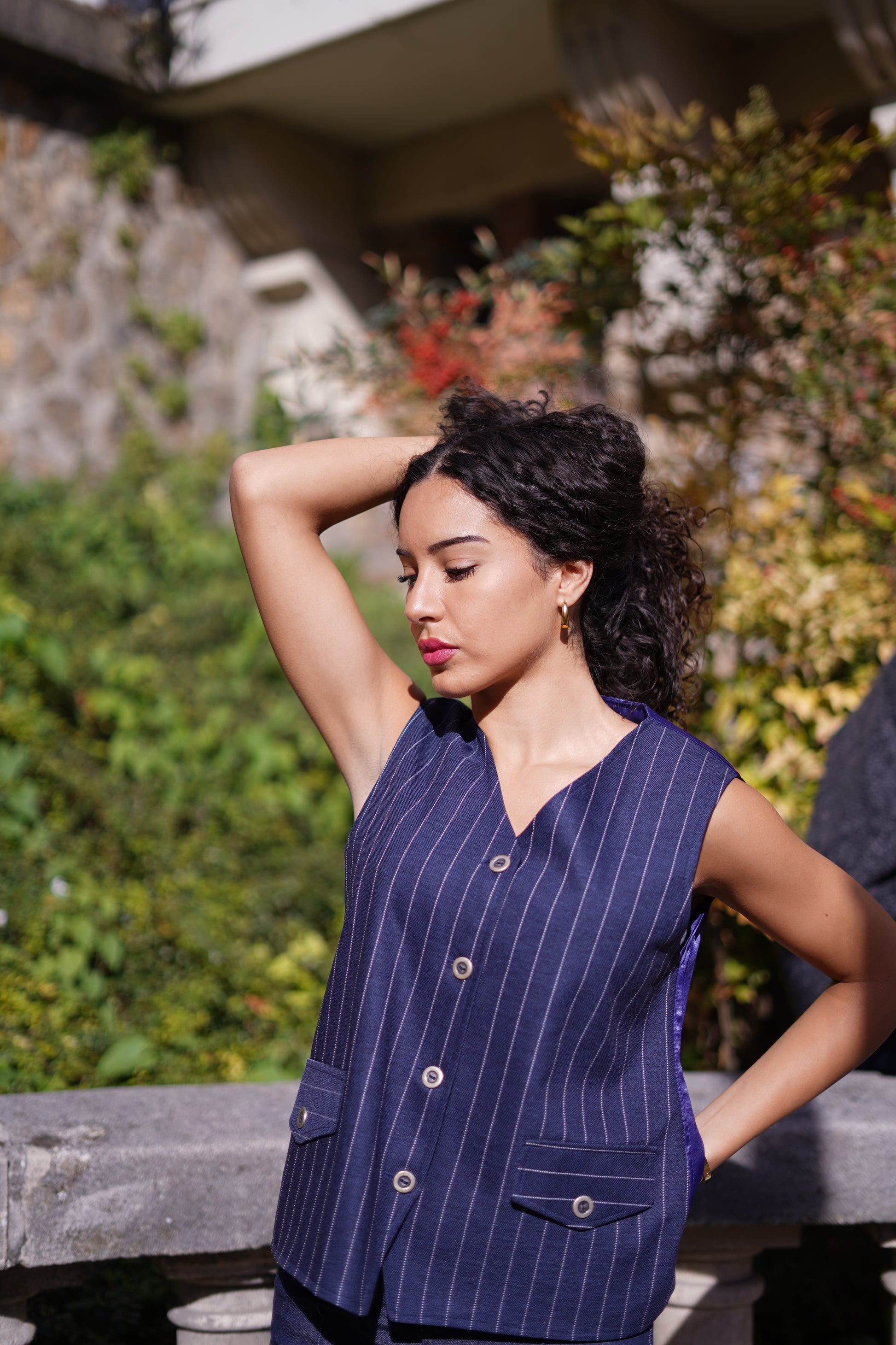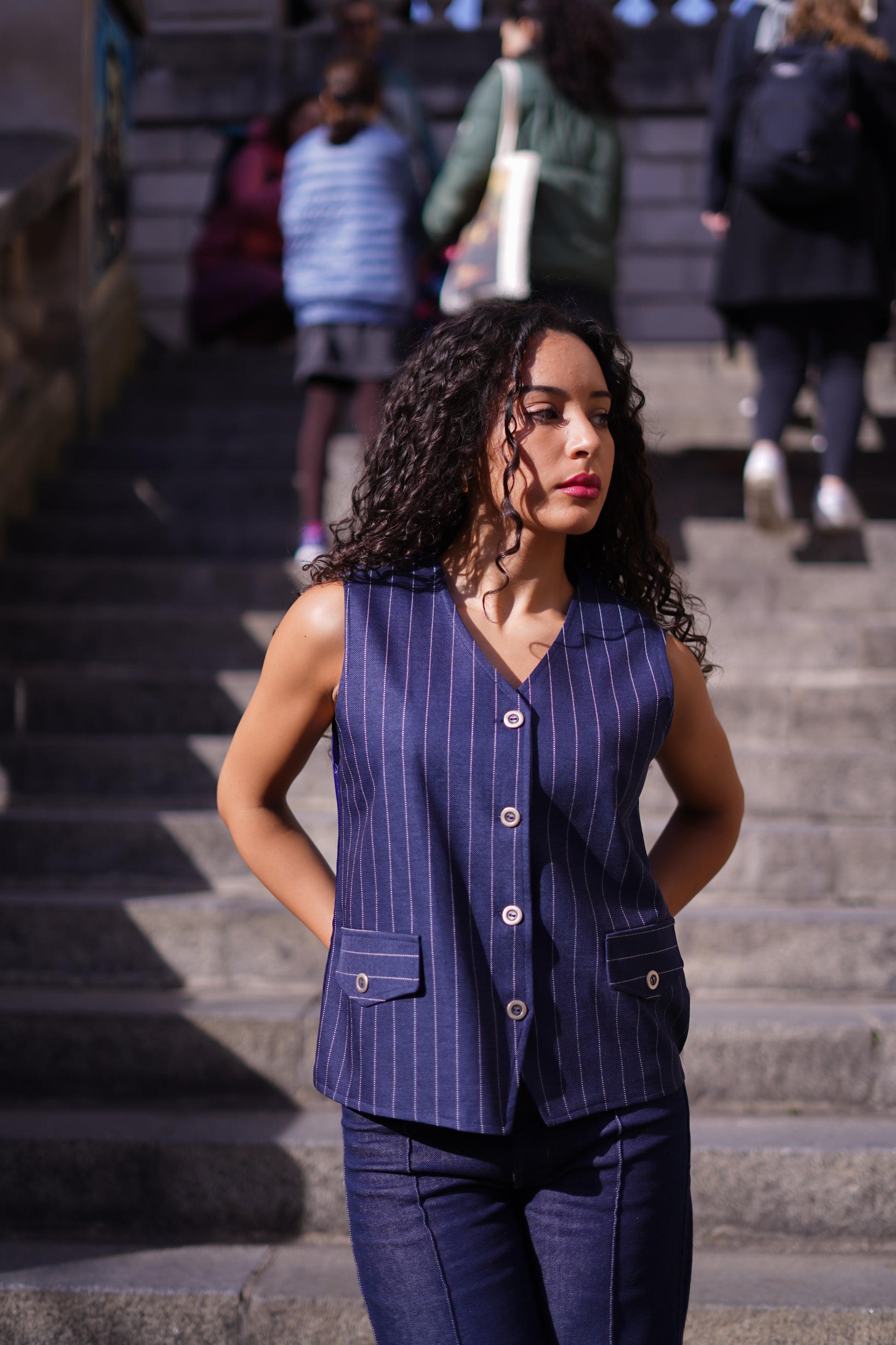 Affirme ton style avec le gilet tailleur ZAYNA à rayures, symbole d’une féminité affirmée et d’une allure contemporaine.