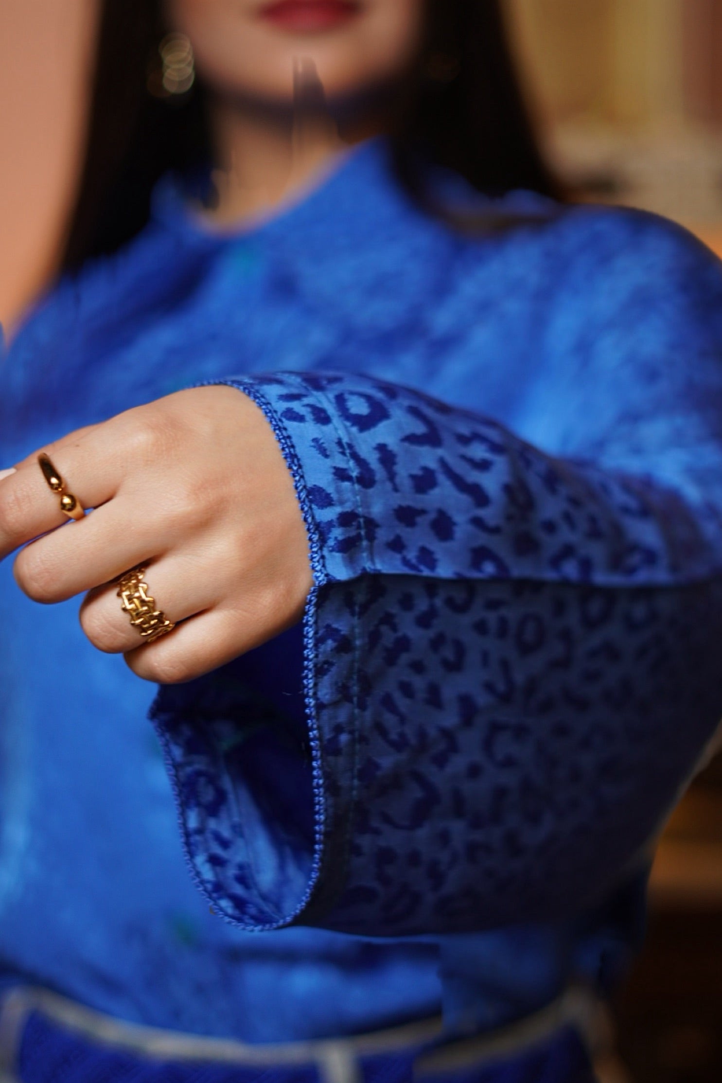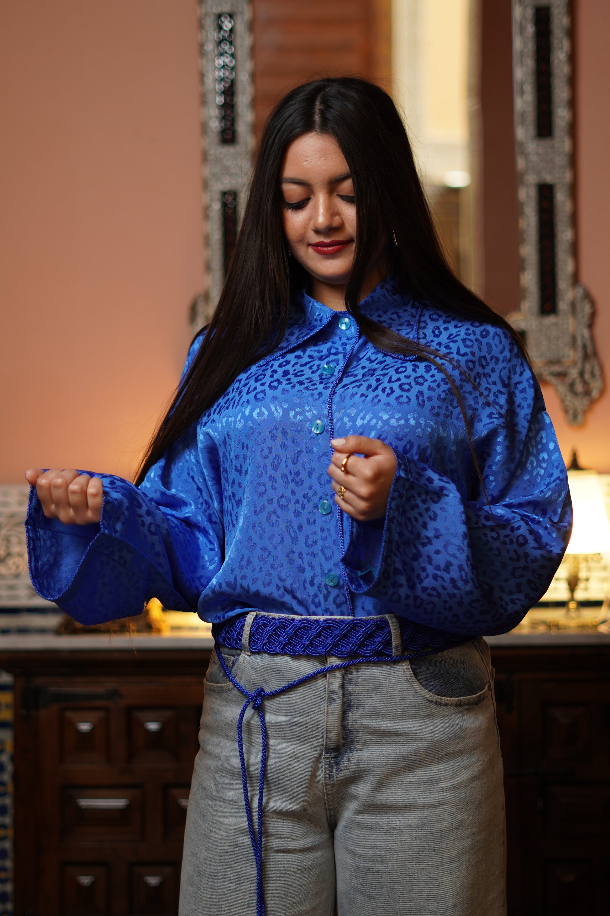 Son motif léopard ton sur ton ajoute une touche audacieuse tout en finesse, sublimée par une finition satinée éblouissante qui capte la lumière à chaque mouvement. Ce chemisier se distingue par ses finitions soignées en derss (broderie traditionnelle marocaine) au niveau du col pointu et des poignets, soulignant encore davantage son caractère unique.