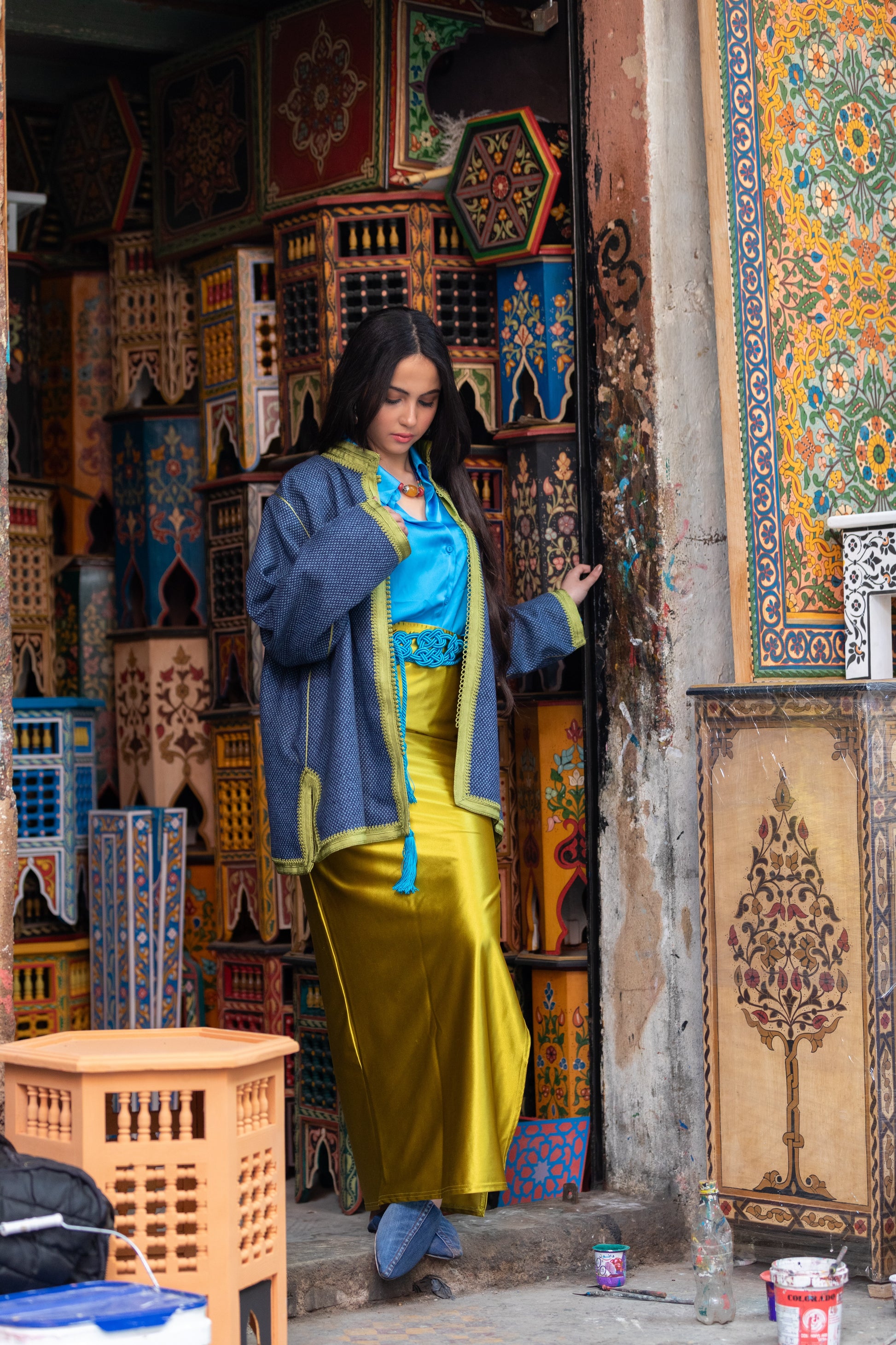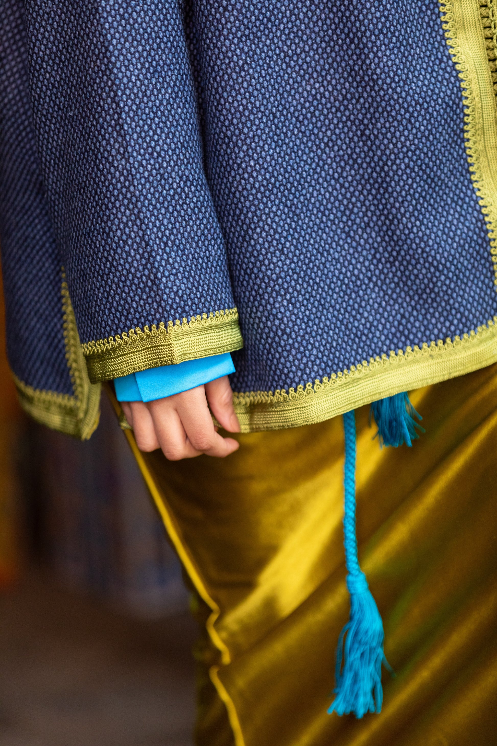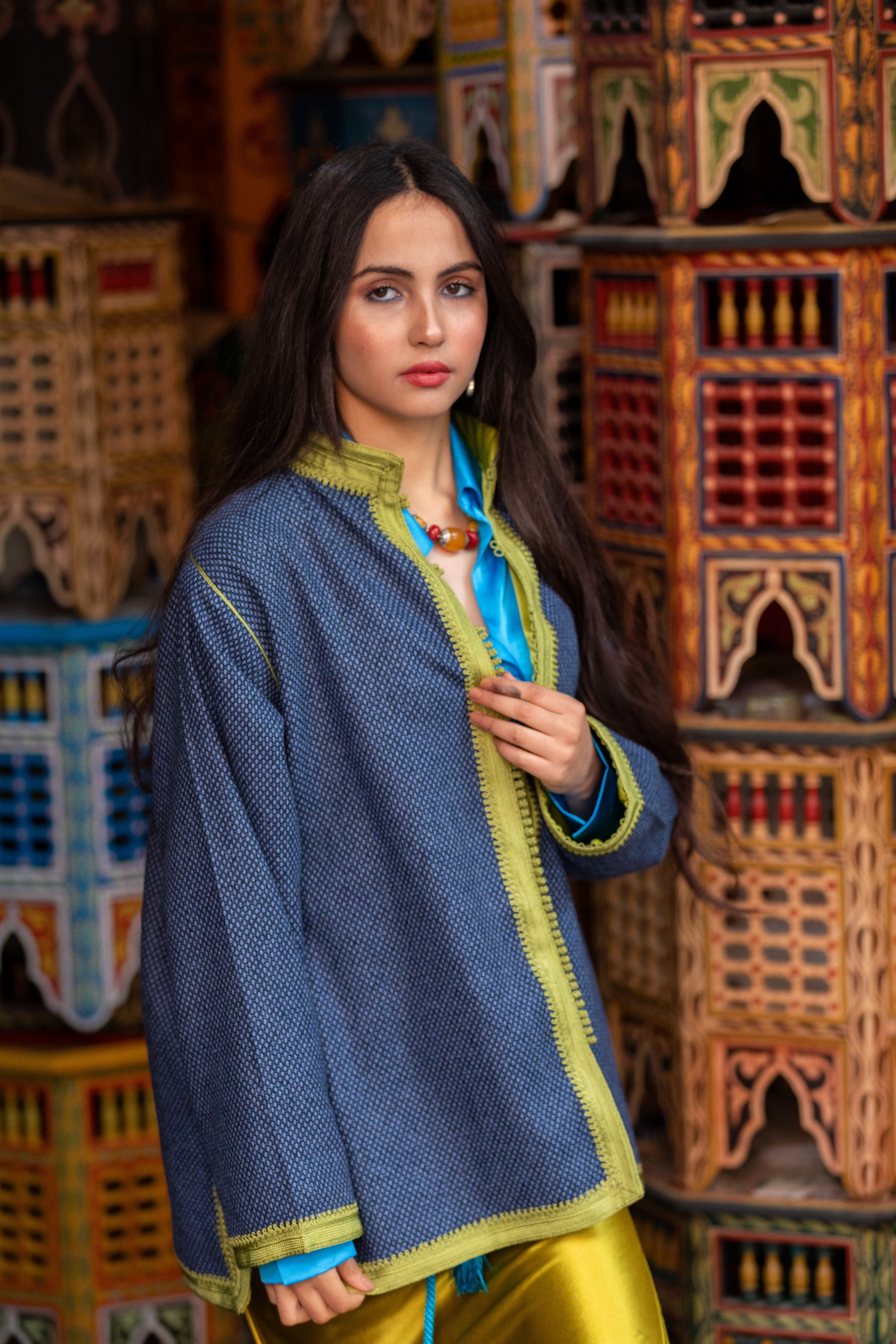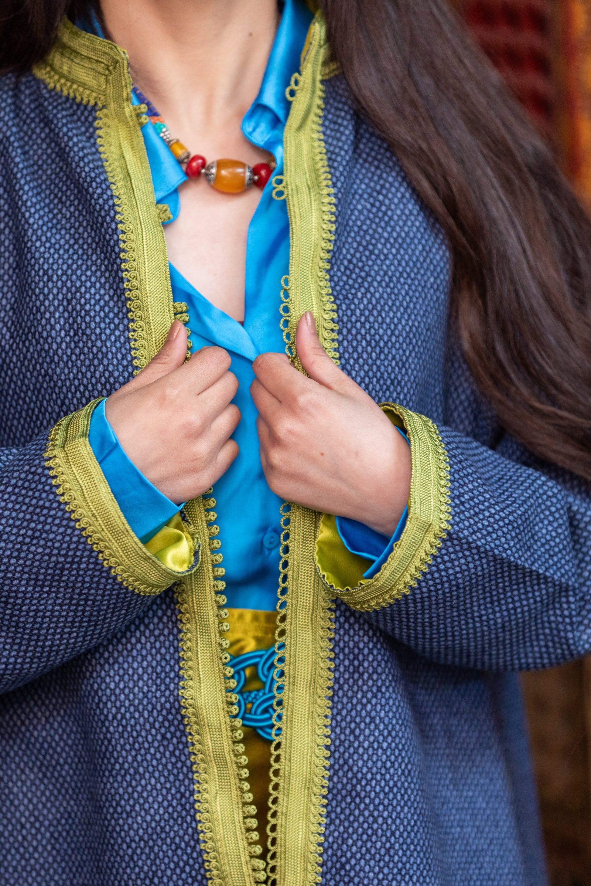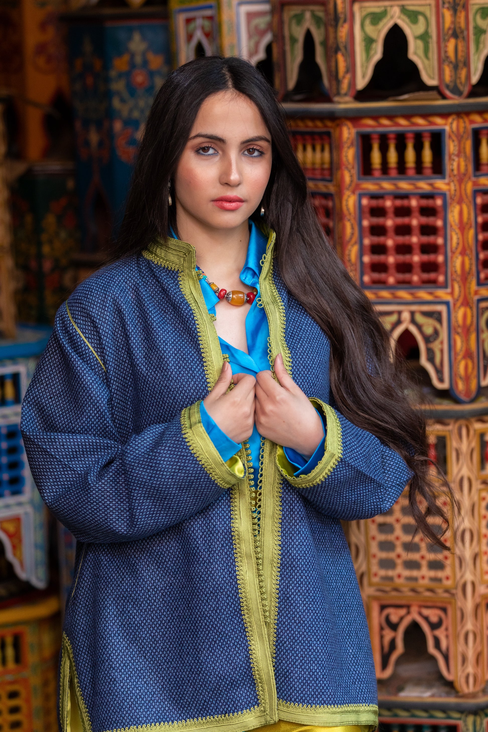 Veste artisanale en laine 100% pure, entièrement réalisée à la main avec une doublure en satin duchesse. Des broderies debana et sefifa ornent les coutures, offrant une touche de luxe et d’élégance intemporelle. Un vêtement haut de gamme, exclusif et fait main, pour un style raffiné.