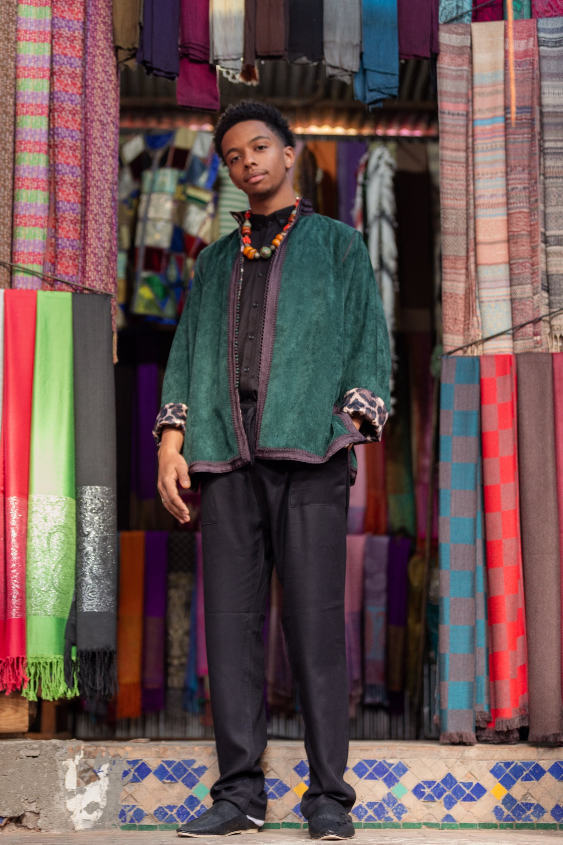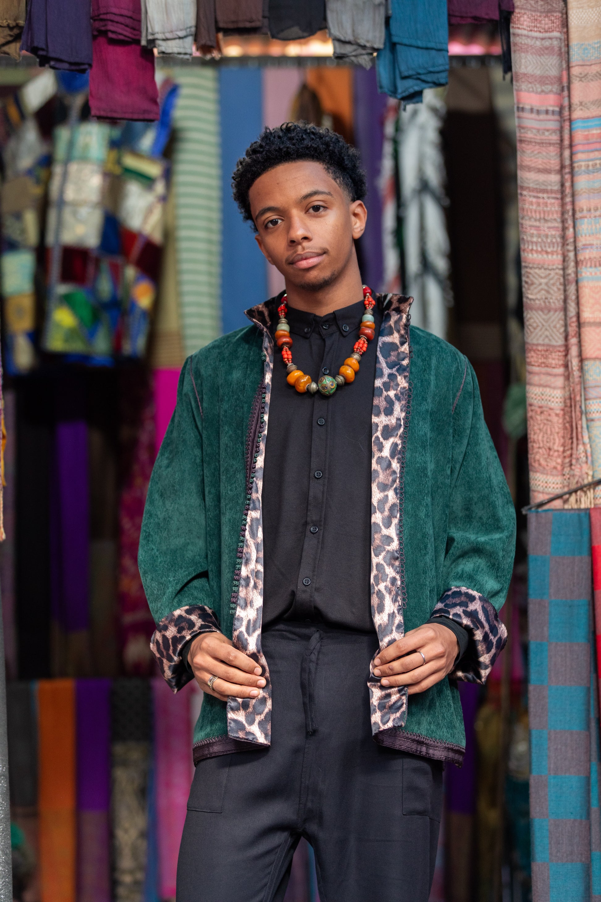 Cette veste en velours, doublée d'un léopard flamboyant, célèbre l'art du fait-main et affirme une identité singulière.